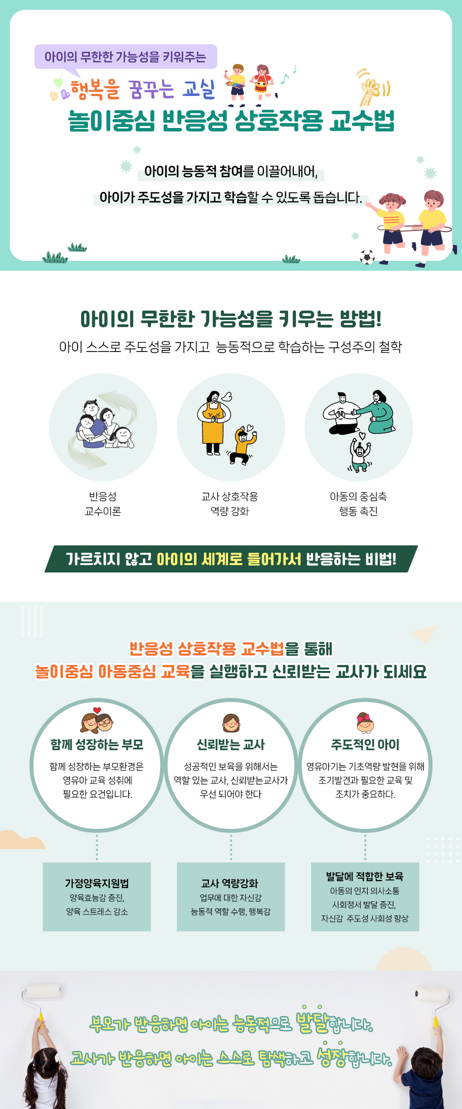 ① 영유아의 놀이를 이해하고, 발달의 원리 및 연령별 발달과업에 적합한 상호작용 이해 및 실천을 통해 아동중심 교육을 제공할 수 있다.